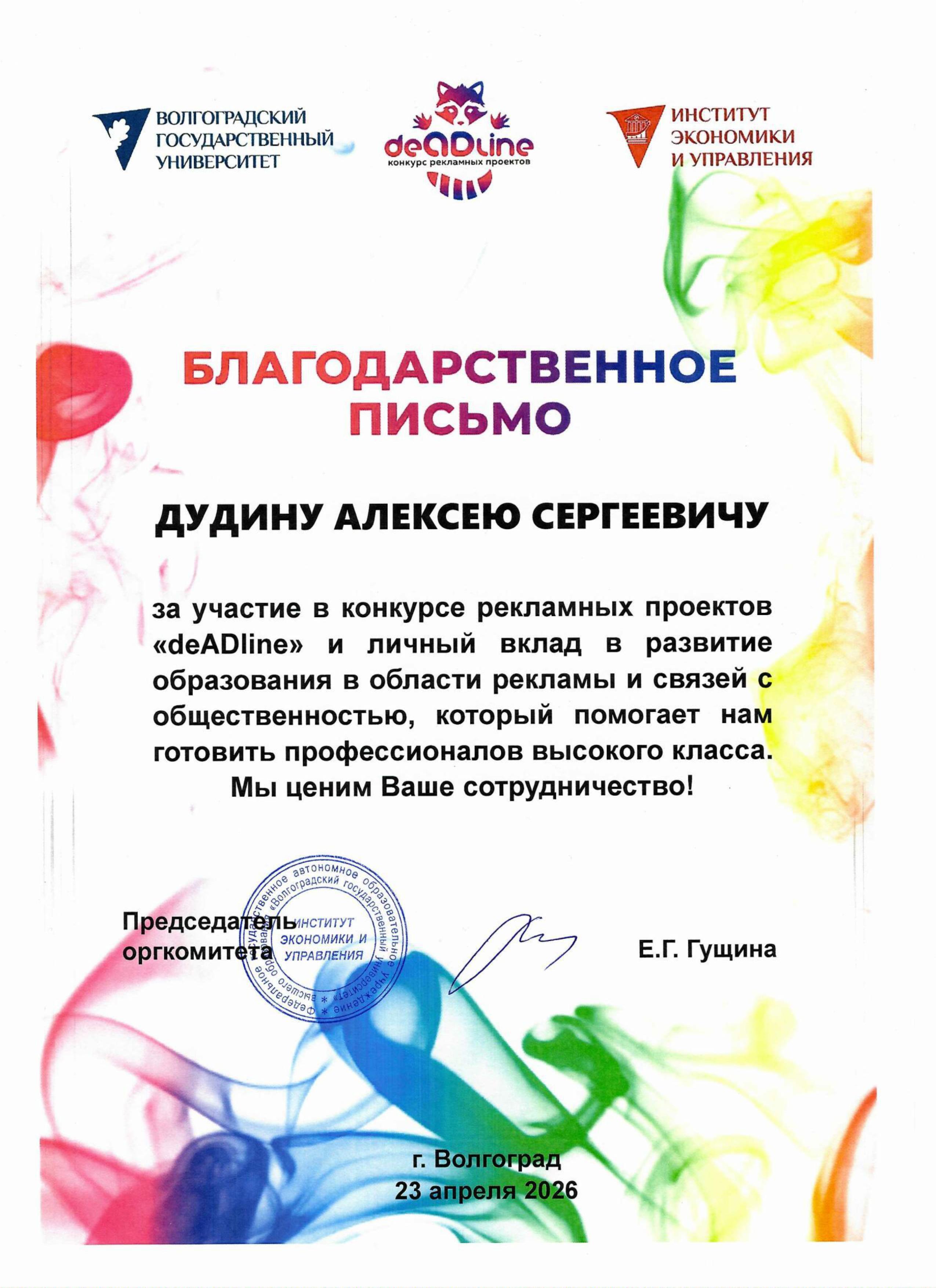 Двадцать третьего апреля 2026 года руководитель Мастерской риторики и публичных выступлений "Меткое слово" Алексей Дудин принял участие в работе жюри, оценивавшем работы, представленные на конкурс рекламных проектов, организованный Институт экономики и управления ВолГУ.
